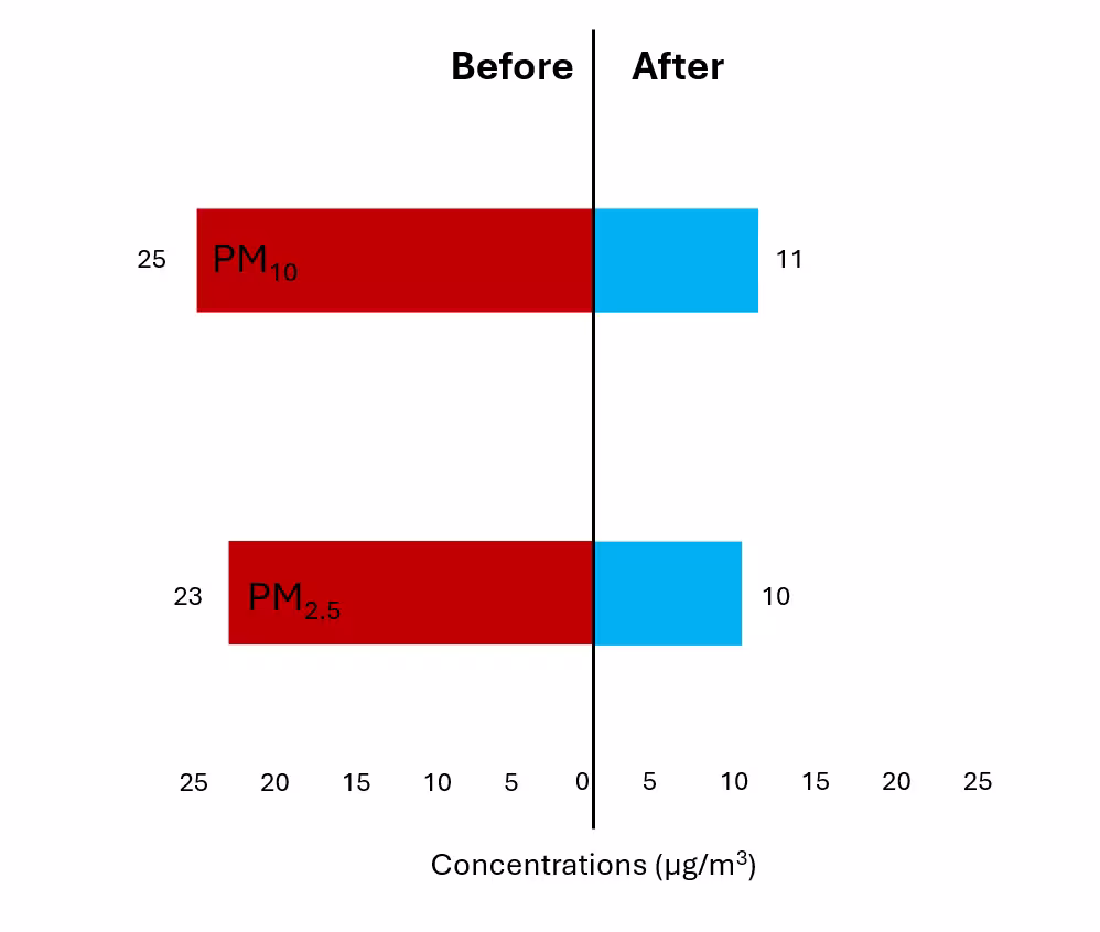 Following installation, PM2.5 concentrations in the affected classroom decreased by more than 50%. This case highlights the influence of building infrastructure on indoor air quality outcomes, from window operability to the containment of emissions from specialised spaces.