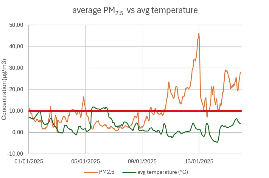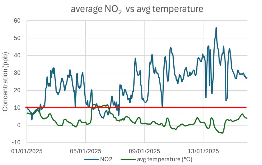 Over a two-week period, several days exceeded both European and Belgian threshold values—10 µg/m³ for PM₂.₅ and 10 ppb for NO₂. On certain days, including 12 January, concentrations were more than twice the European and Belgian limits and up to four times higher than the guidelines set by the World Health Organization.