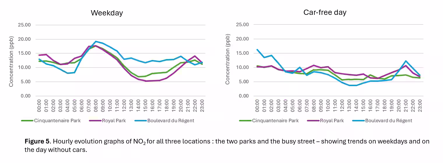 Nitrogen dioxide levels in the parks were generally higher during the working week, reflecting their proximity to busy roads. This pattern became more pronounced during colder periods, when weekend NO₂ concentrations increased on Boulevard du Régent—likely linked to higher car use in lower temperatures.