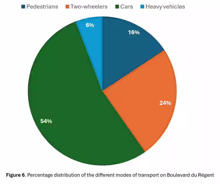 Traffic counts from a Telraam sensor on Boulevard du Régent indicate that roughly 6,500 vehicles pass through this corridor each day. The hourly distribution of traffic highlights pronounced peaks during commuting hours.